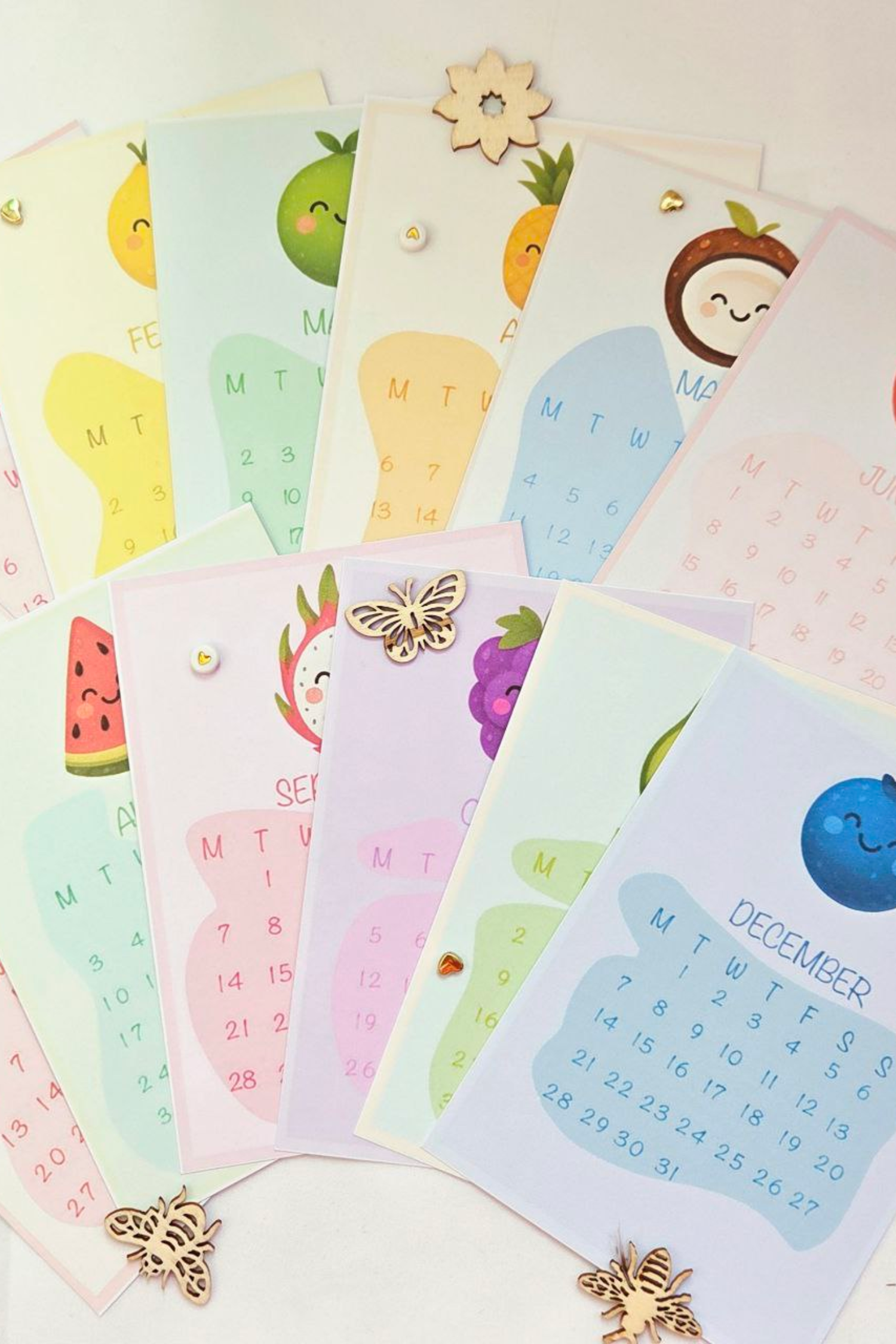 - Thick pastel card inner pages — cheerful fruity shades